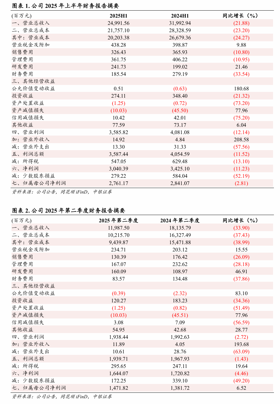 公司发布2025年中报。2025H1公司实现营业总收入249.92亿元,同比降低21.88%;归母净利润27.61亿元,同比降低2.81%。2025Q2营收119.88亿元,同比降低33.90%,环比降低7.82%;归母净利润14.72亿元,同比增长6.52%,环比增长14.15%。公司发布中期分红预案,每10股派发现金红利2.00元(含税)。