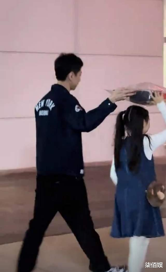 除了用手帮酒窝挡雨外,对于手上拿着一束花的酒窝,张维伊还将花横着放在酒窝头上给他挡雨,看得出来,张维伊还是很会照顾孩子的。